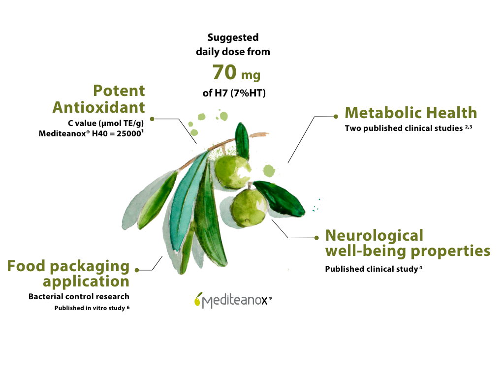 Mediteanox® is an olive fruit extract (Olea europaea L.) standardized to hydroxytyrosol, a powerful antioxidant compound known for its cardiovascular properties.